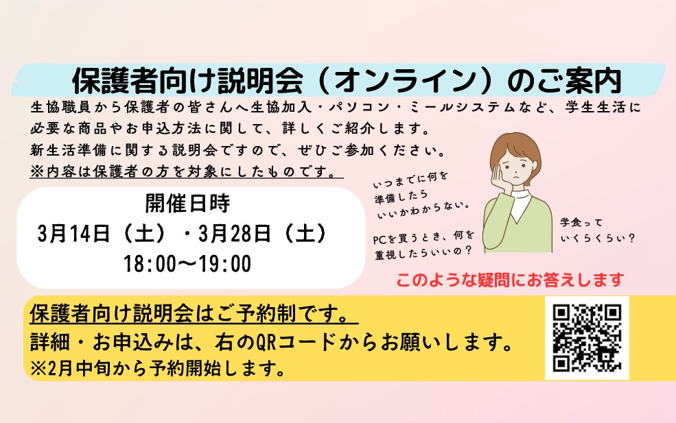 奈良教育大学生協学生委員会では新入生の皆さん向けに数多くの新入生歓迎企画を開催いたします! 「友達作り」や「日々の学校生活」、「履修相談」など大学生活を送る上で有意義な企画が盛りだくさんとなっておりますので、ぜひご参加ください!! また、保護者の方向けに「新生活準備」に関する説明会を開催いたしますのでこちらの方もぜひご参加下さい 新入生の皆さんのご参加をお待ちしております!