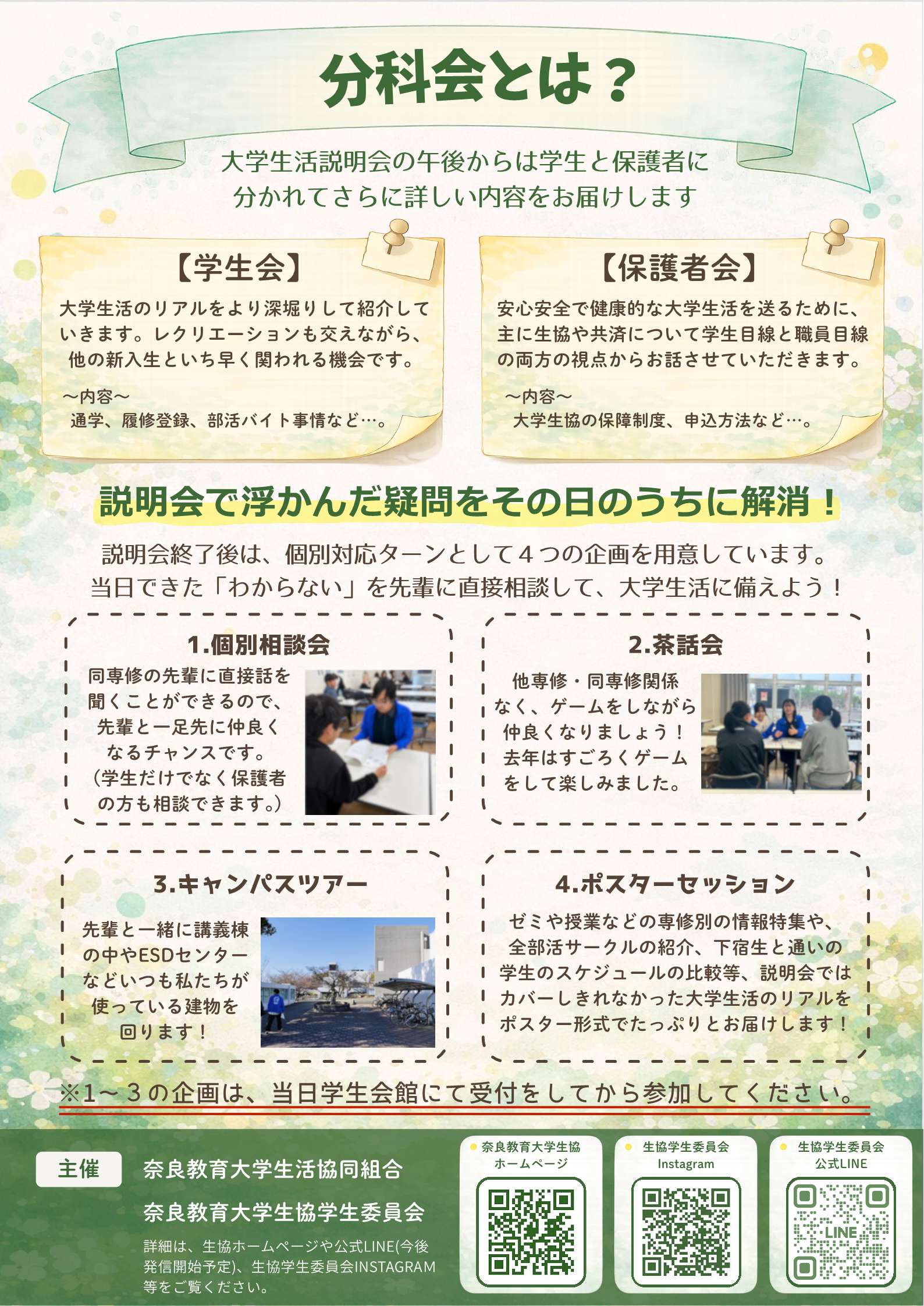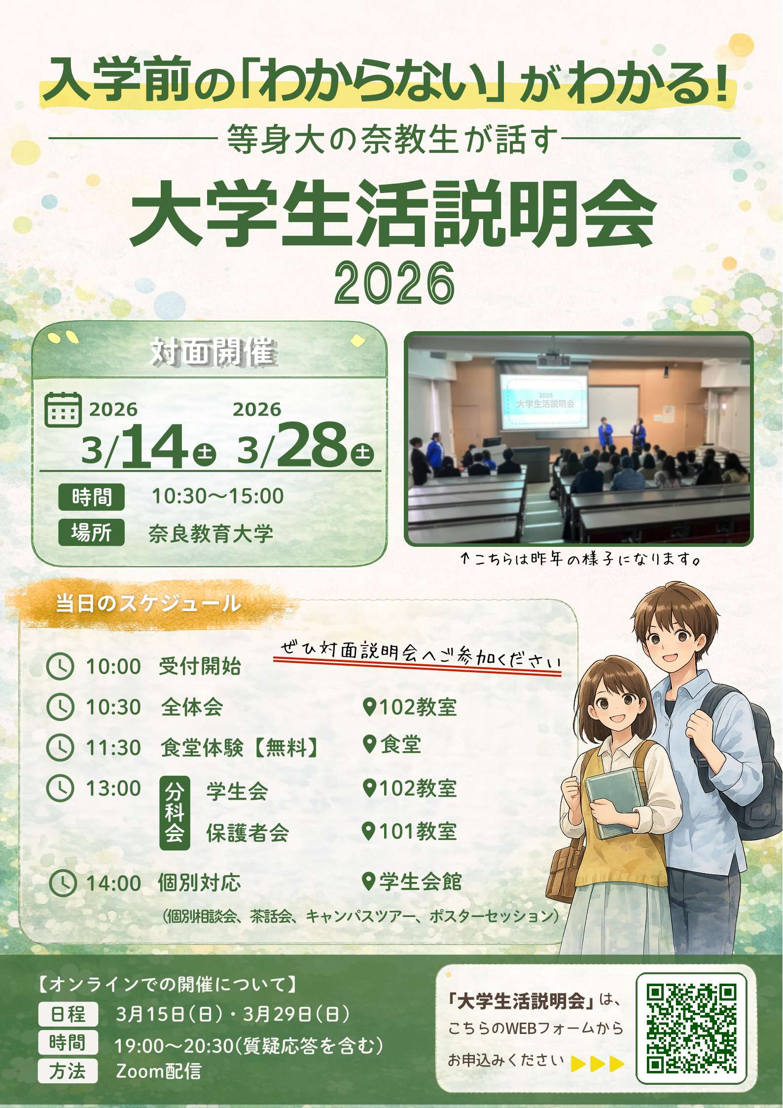大学生活説明会では奈良教育大学での年間スケジュールや1日の生活の様子、4年間の学びについてなど、先輩である私たちが実体験をもとに奈教生の大学生活をたっぷりご紹介します!この説明会を聞くと奈良教育大学での生活のイメージが出来ること間違いなしですし、大学生活の”分からない”が分かる説明会になっています! 対面説明会では、「食堂利用体験(無料)」や先輩学生となんでも相談できる「個別相談会」(保護者も方も可)、先輩と一緒に大学内を回る「キャンパスツアー」、同じ春から奈教生になる学生といち早く合流できる「茶話会」、説明会では紹介しきれなかった大学生活の色々や専修別の情報がたっぷり詰まった「ポスターセッション」を準備しています。お時間の許す限り、ご参加ください!!
