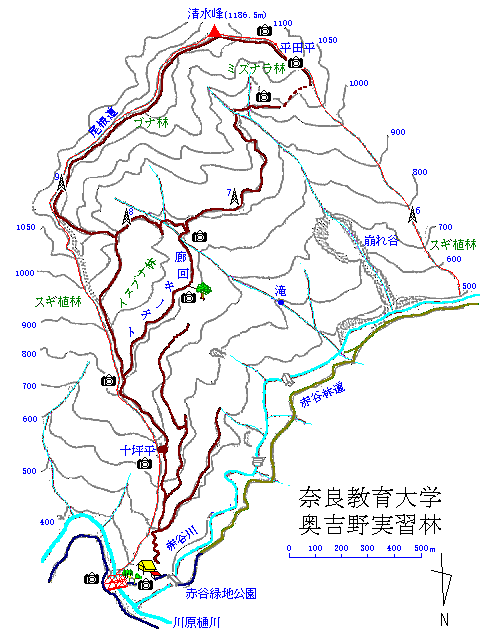奥吉野実習林の地図です。カメラマークの部分をクリックすると写真が見られるようにしました。