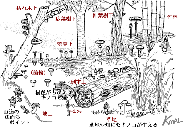 ところが実際に外に出てみると枯れ木以外のいろいろな物からキノコが生えていることに気づくでしょう。落ち葉から生えているように見えるもの、地面から生えているように見えるものがたくさんあるでしょう。そのキノコが地面から生えているのか、腐った落ち葉から生えているのか、埋もれた木材から生えているのか、本当のところはキノコの根元を注意深く掘って確かめるほかありません。もっと変わった物(生きた樹木の根や昆虫の死体やモグラの便所跡など)から生えていることもあります。