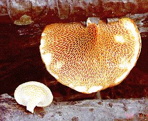 雑木林では普通に見かけるキノコで、よく広葉樹の枝に発生している。傘の直径は3p〜5pが多い。写真は傘の下面を写したもの。傘の下面の管孔が大きく特徴的だ。名前の由来が分かるでしょう?