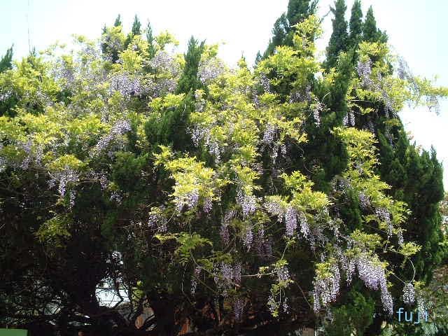 薄い紫色の花(まさに藤色)で房状の花序を、ぶどうがぶらさがっているような感じでつけます。つる性であるため他の植物に寄りかかっているか、またはきちんと藤棚につるをからめながら成長しています。
