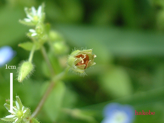 アップ写真の個体は毛も多いし背丈も高く、ウシハコベかなぁ?と思ったのですが、花柱(雌しべの先のひものようなもの)を見れば見わけはつきました。花柱が3つに分かれているのがハコベで5つに分かれているのがウシハコベなのでハコベと同定しました。