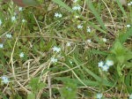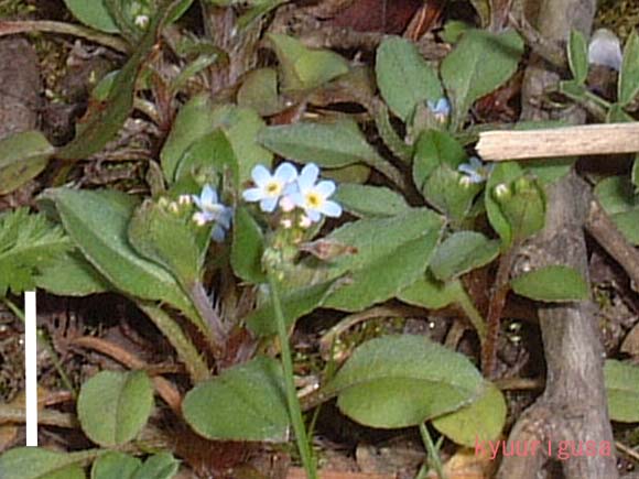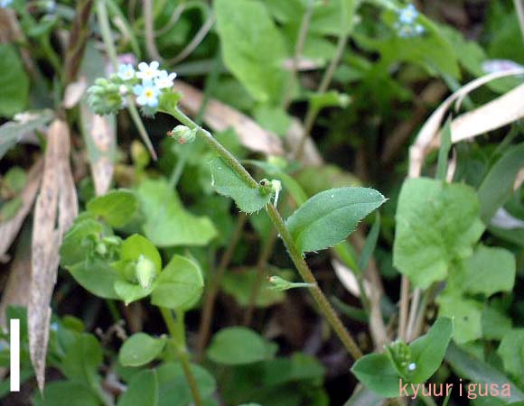 よく似ている花でハナイバナというのがあります。花の色や大きさもよく似ているのですが、キュウリグサは花が上の方に並んでついているのに対し、ハナイバナは葉の間に花がついています。