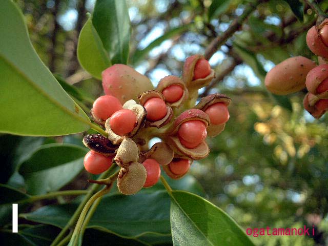 果実は外側の殻がぱっくり割れて、オレンジ色の種子が中から出てきます。色がとてもかわいらしいです。
