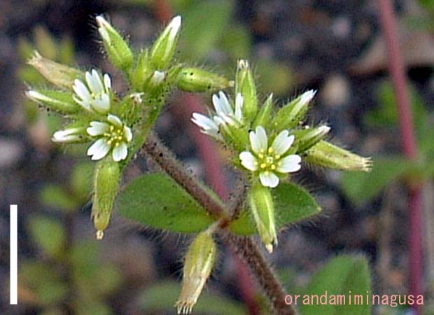 茎に小さい葉が向かい合ってついていて、それがねずみの耳に似ているので「ミミナグサ(耳菜草)」、異国のものという意味で「オランダ」と名前がついたそうです。