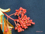 色が赤く、果実の先端にめしべの柱頭が残っているため、珊瑚の加工品に見た目が似ているのでこの名前がついたそうです。赤く色づいた果実はその後、藍色っぽく変化していきます。