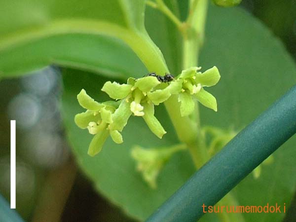 花の後ろ側にいる黒いのはアリです。たくさんのアリがツルウメモドキの上を歩いていました。