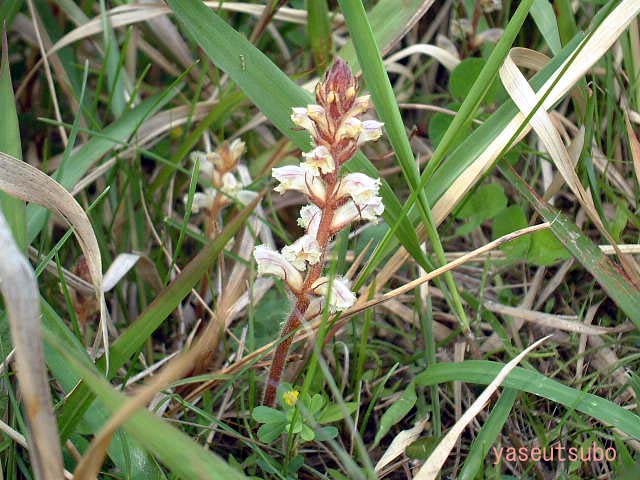 5月〜6月にかけて、主にマメ科植物に寄生して花を咲かせる寄生植物。ヨーロッパから北アフリカにかけての原産で、帰化植物です。マメ科以外に、セリ科、キク科の植物の根に寄生根で寄生して、養分を吸い取って成長しています。写真のヤセウツボは、近くに生えていたマメ科のコメツブツメクサに寄生していると思われます。写真の黄色い花がコメツブツメクサです。
