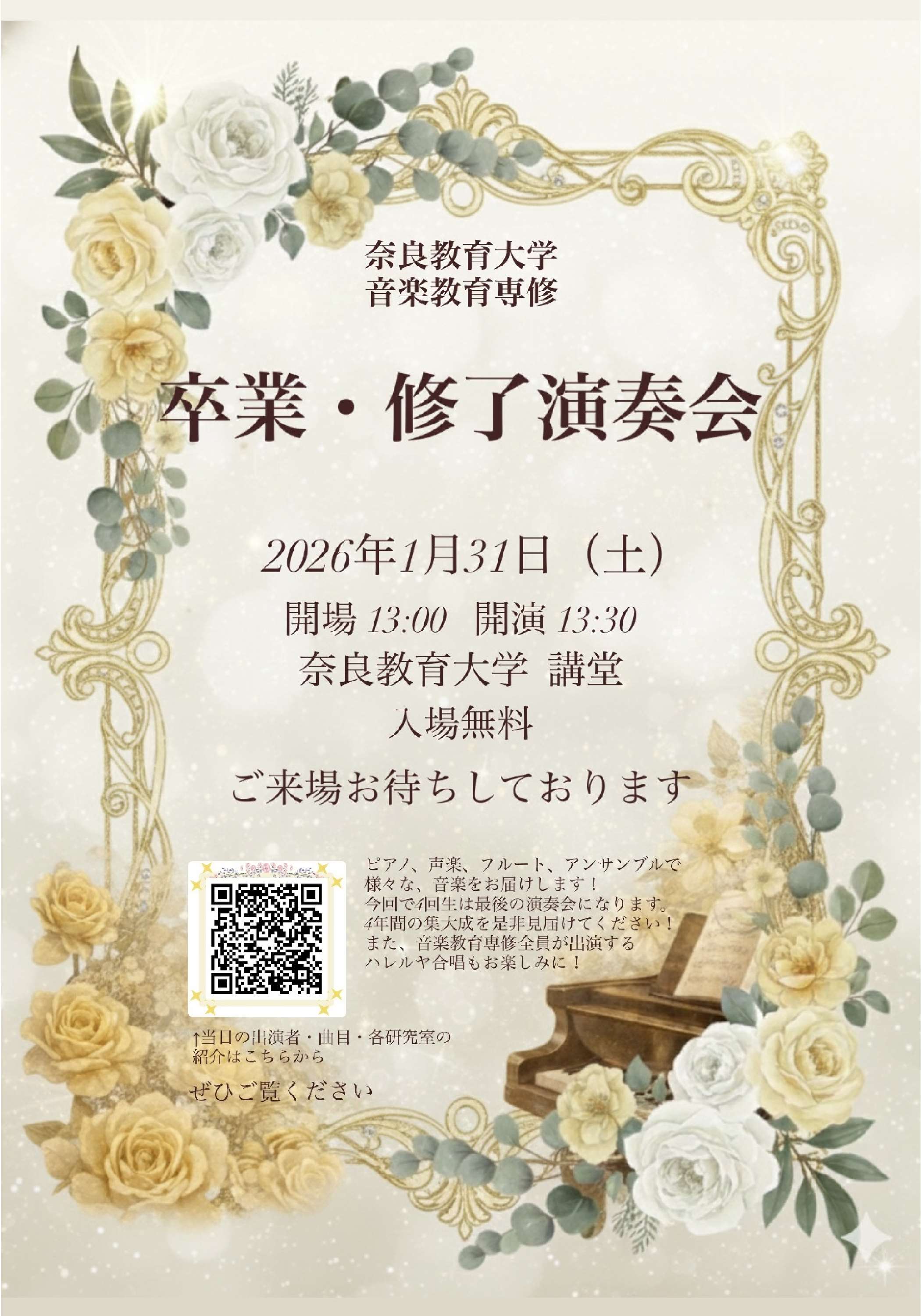 奈良教育大学音楽教育専修では、令和8年1月31日(土)に音楽教育専修主催の卒業・修了演奏会(卒業・修了研究成果発表)を開催します。独唱、ピアノ独奏、管楽器、8手連弾、音楽教育専修全員が出演するハレルヤ合唱など、様々な音楽をお届けします。出演者にとっては最後の演奏会です。皆様のご来場を心よりお待ちしております。