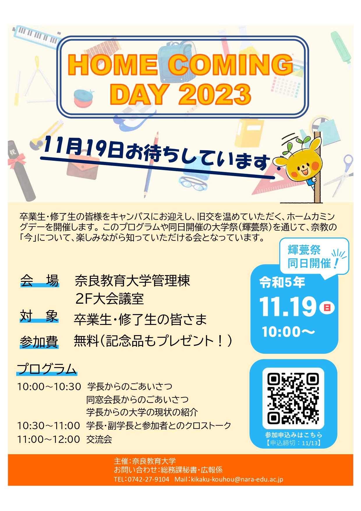 奈良教育大学では、卒業生・修了生の皆様をキャンパスにお迎えし、旧交を温めていただく、ホームカミングデーを11月19日(大学祭2日目)に開催します。
