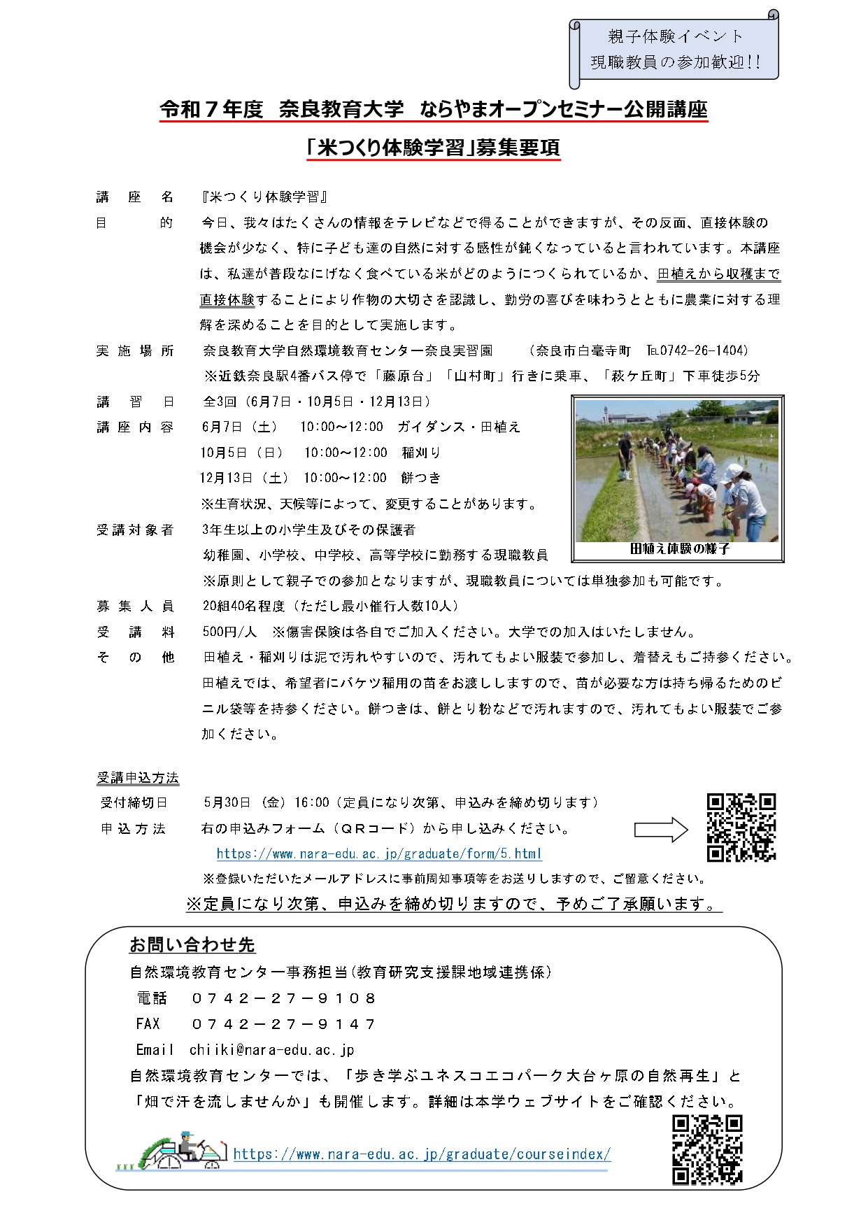 教育研究支援課・地域連携係(自然環境教育センター事務担当) 電話 0742-27-9108 メール chiiki |