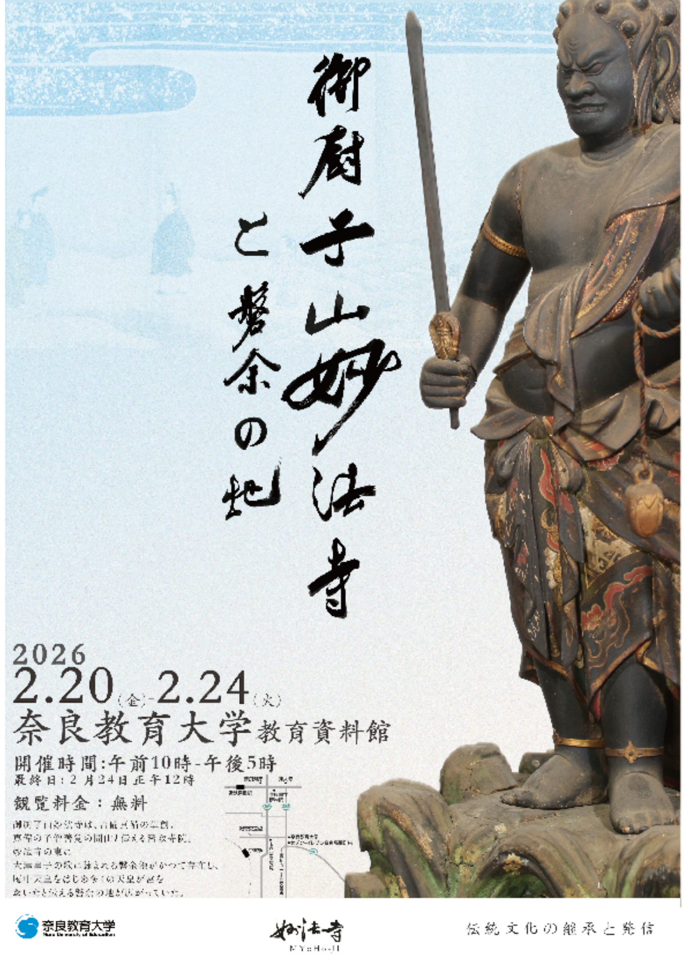 橿原市東池尻町所在の御厨子山妙法寺は、吉備真備の草創、真備の子僧善覚の開山と伝えており、縁起では長谷寺との所縁が語られ、また現在は高野山真言宗に属して正純密教の美術が数多く伝来しています。妙法寺の東には大津皇子の歌にも詠まれる磐余池がかつて存在し、『日本書紀』に履中天皇をはじめ多くの天皇が宮を置いたと伝える「磐余」の地が広がっていました。本企画展は、造立当初の彩色を残す不動明王立像、磐余池を辞世の歌で詠んだと伝わる大津皇子に関わる作品といった、妙法寺の文化財と磐余の文化的景観に着目し、構成しています。