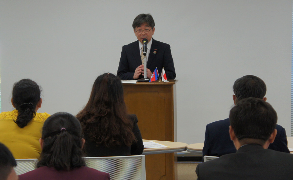 開講式において加藤久雄 本学学長が挨拶し、「本学で研修に取り組んでいただけることを光栄に感じている。カンボジアの教員養成に末永く貢献したいと考えているので、教員にとって重要な要素である「学び続ける」ということを胸に、研修に取り組んでいただきたい。そしてぜひ奈良の文化や自然も楽しんでいただきたい。」と参加者を激励しました。