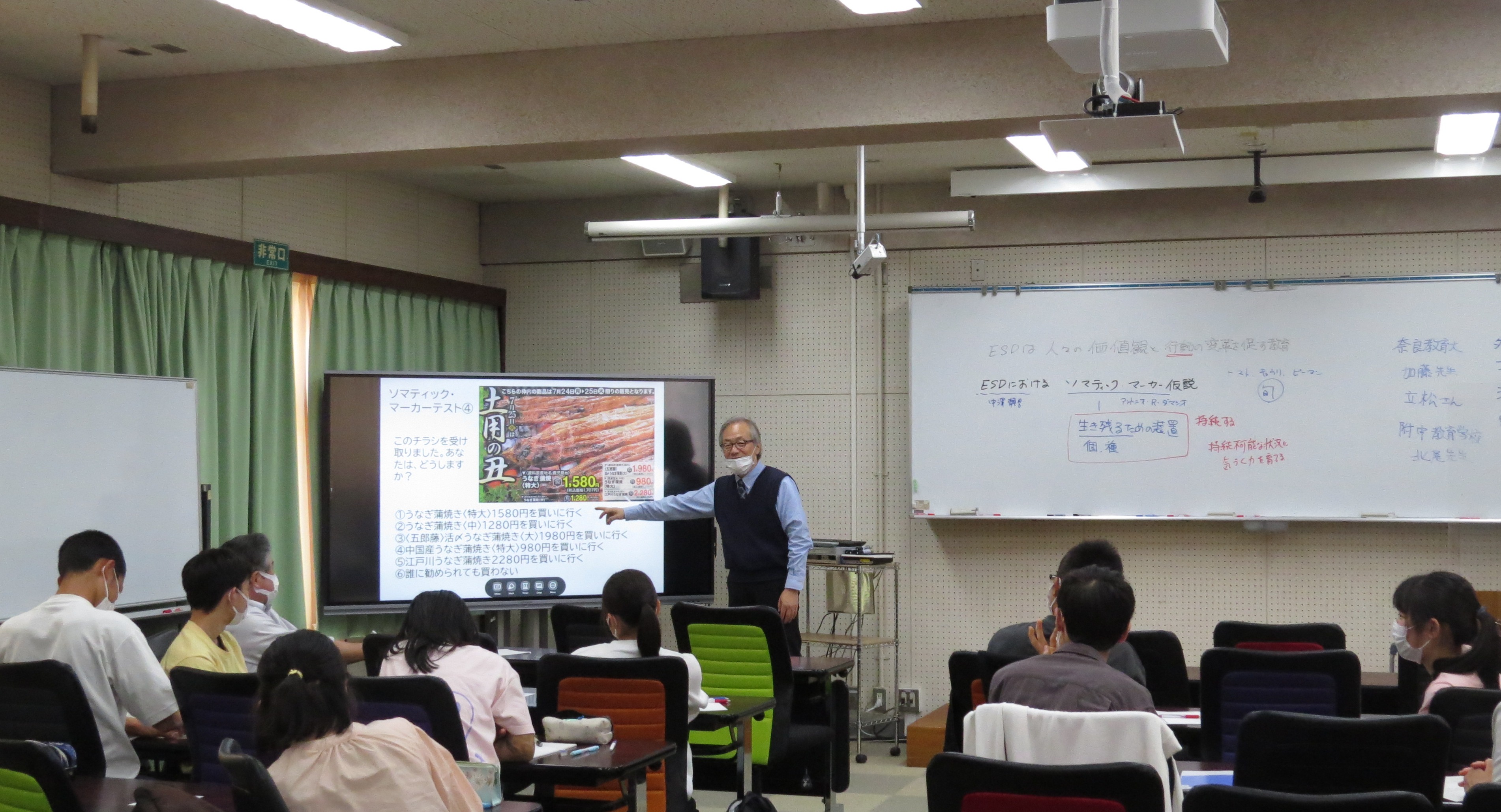 授業では、はじめに参考として厳罰主義、ナッジについて説明した後、ESDの「その人が意識して自ら選択してよい行動をとることが出来るように教育する」という考え方についてソマティック・マーカー仮説に関連付けながら解説しました。