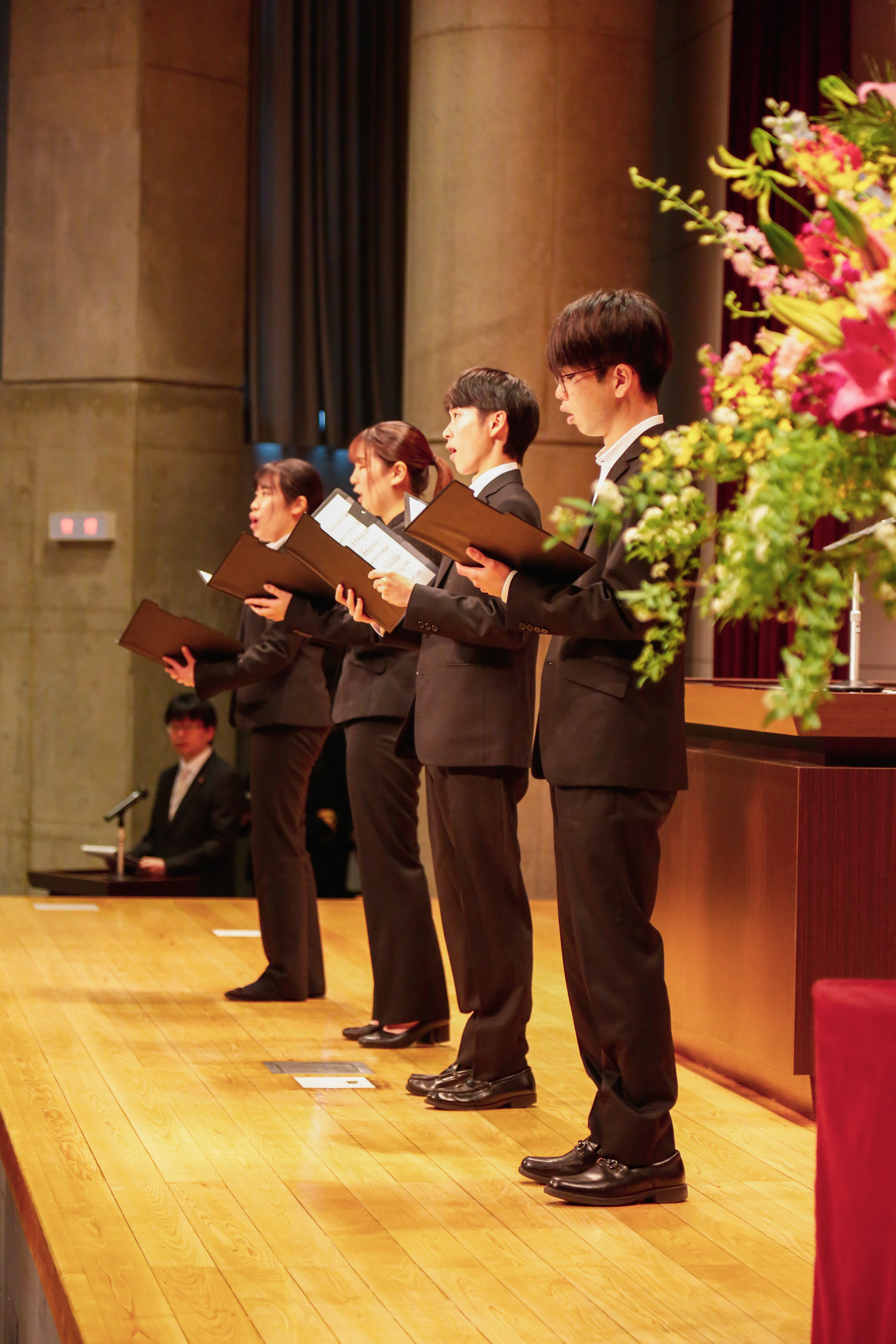 学歌演奏では、合唱を大学院教育学研究科2回生の水口綾乃さん、教育学部教科教育専攻音楽教育専修4回生藤本尋巳さん、4回生の若林憩さん、2回生の長山洋弥さんに、ピアノを大学院教育学研究科2回生の村田実優さんに演奏していただきました。演奏が終わると、新入生と保護者から大きな拍手が沸き起こりました。